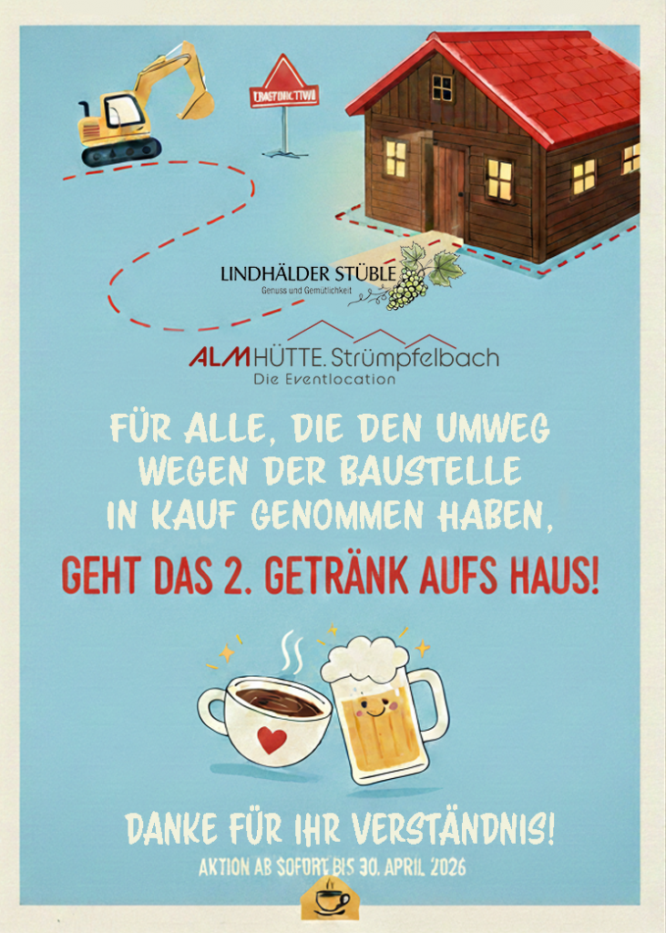 Unsere Almhütte braucht mehr Platz. Den schaffen wir demnächst gleich nebenan! Aus dem „Weißen Saal“ im Lindhälder Stüble wird die „Lindhälder-Alm“. Modern, stylisch – aber mindestens genauso urgemütlich. Weiterhin mit Platz für bis zu 60 Personen.